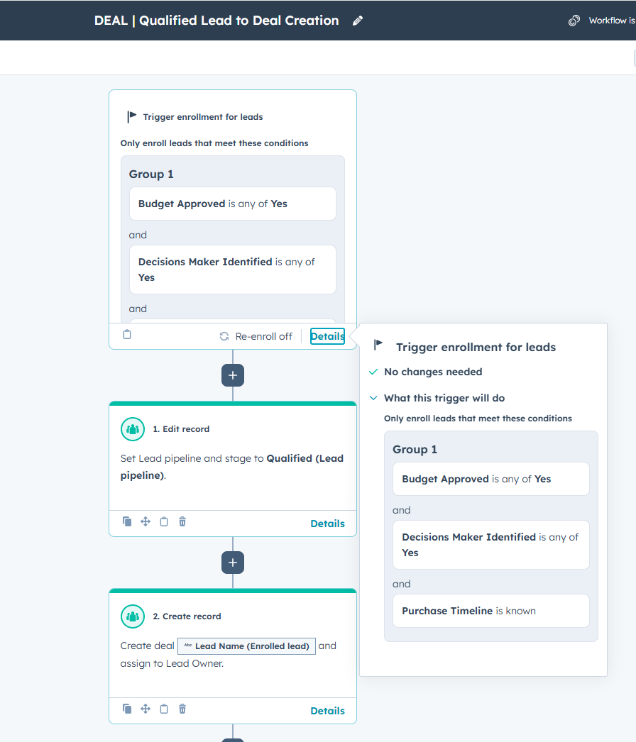 - Then, add a simple workflow that property that auto-calculates and moves the lead stage to “qualified” when all three boxes are checked.